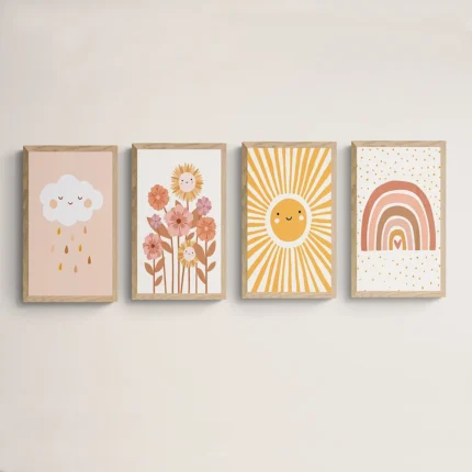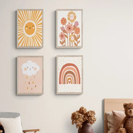 Colorful Rainbow Sun Cloud flower Poster Prints Wall Art Boho Style Canvas Painting for Child Nursery Decoration Girl Room Art