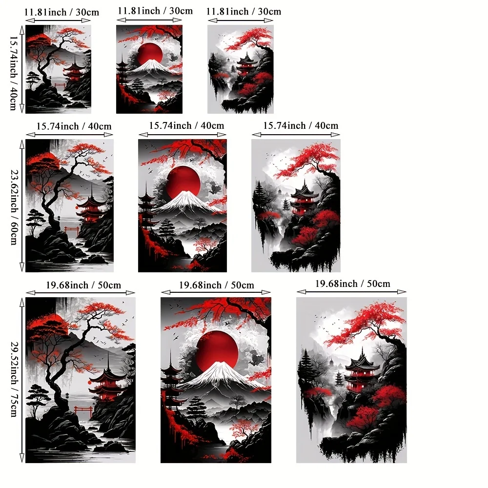3pcs Frameless Japanese Natural Landscape Canvas Painting Black And Red Posters Vintage Ink Art Wall Prints For Living Room Home