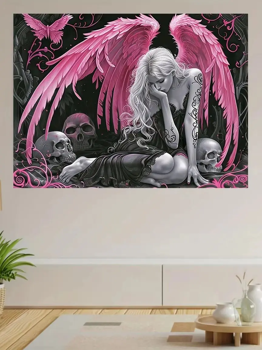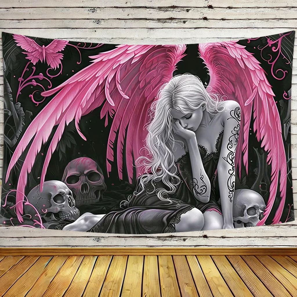 Gothic Pink Winged Angel Wall Art Wall Tapestry Dark Fantasy Skull Decor for Home Bedroom Living Room Wall Hanging Wall Mat