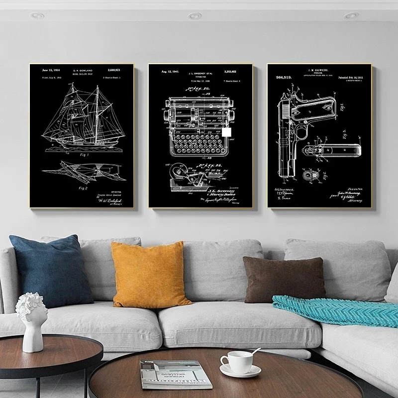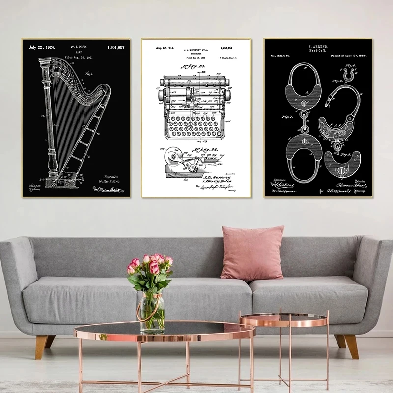 Patent Black And White poster Vintage Musical Instruments Sports Equipment Gun Drawing Canvas Printing Poster Home Room decor